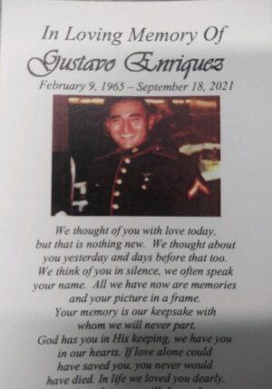 Gustavo Enriquez, known to all who loved him as “Gus”, was a strong 56 yr Marine veteran who always kept in good shape.  He was loved by his family as a husband, father, and “Papa”. On 8/22/21 he began experiencing symptoms of covid. He sought medical help the next day but by 8/24 his oxygen level dropped to the 80s then down to 64. He was experiencing chest pain and had difficulty breathing.  Ann, his wife, brought him to Kaiser hospital but was not allowed in and was told to check back in 2 hours.  She sat and waited in the parking lot.